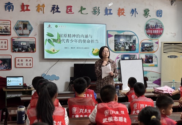 活动伊始,由西华大学人南校区的周欣乔老师为红领巾志愿者们做了题为“屈原精神的内涵与新时代青少年的使命担当”专题讲座。她从端午节习俗的由来,谈到了屈原的精神内涵:“爱国、求索与坚守”,并与新时代青少年“胸怀家国,勇于创新、坚守正道”的使命担当联系在一起,希望在座的青少年们能以屈原为镜,立大志、明大德、成大才、担大任,在民族复兴的伟大实践中,书写无愧于时代的青春篇章。