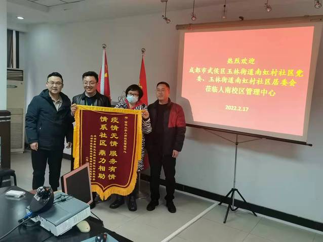 2月17日下午,成都市武侯区玉林街道南虹村社区党委书记梁新燕及社区两委成员一行前来人南校区管理中心交流走访,并向校区赠送了印有“疫情无情 服务有情 情系社区 鼎力相助”字样的锦旗。
